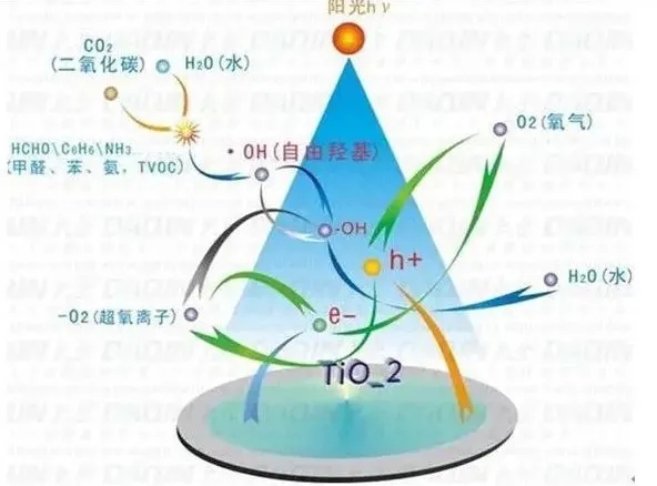 凈化原理:在光源照射下,光觸媒能夠利用特定波長光源的能量產生催化作用(氧化還原反應),使周圍的氧氣及水分子激發成具高活性的自由基,這些自由基,也有說法叫"光等離子體",幾乎可分解所有對人體或環境有害的有機物質及部分無機物質。(光觸媒,也稱為光催化劑,是一類以二氧化鈦為代表的,在光的照射下自身不起變化,卻可以促進化學反應,具有催化功能的半導體材料的總稱。)