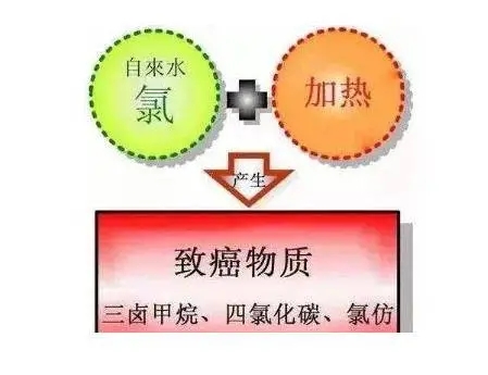 自來水中的氯經過加熱會產生致癌物質:三鹵甲烷、四氯化碳、氯仿。