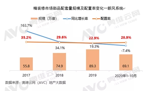 根據奧維云網地產大數據監測顯示:2020年1-10月,新風系統配套規模近70萬套,同比降幅7.4%。配套規模下滑是受到精裝大盤的影響,且增速是跑贏了精裝大盤;并且其同比降幅好于一級配套部品。雖然其精裝市場規模出現下滑,但是新風在精裝修市場的配套率卻穩步上升。目前新風系統已經屬于二級配套部品,預計未來配套率可達到70%,在精裝修、高端住宅、養老社區以及舊房改造中仍然有很大的市場潛力。