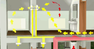 新風系統是開放性的循環系統,由風機、進風口、排氣口和各種管道和接頭組成。風機通過管道與一系列的排風口連通,啟動風機,讓室內形成負壓,室內受污染的空氣經過排風口及風機排向室外,室外新鮮空氣經進風口進入室內。(以下為動態圖,緩沖較慢,耐心等待哦~~)