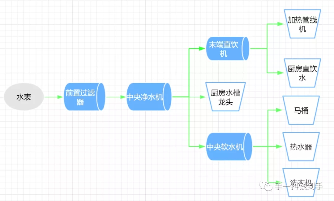 于是開(kāi)始著手了解全屋凈水,走訪了好幾家建材家居市場(chǎng),發(fā)現(xiàn)市場(chǎng)上的凈水品牌真是五花八門(mén),讓人眼花繚亂,逛了一圈之后,基本搞明白了全屋凈水到底是怎么回事,全屋凈水系統(tǒng)主要包括四大件,分別是前置過(guò)濾器、中央凈水機(jī)、中央軟水機(jī)和末端直飲機(jī),具體運(yùn)轉(zhuǎn)流程如下: