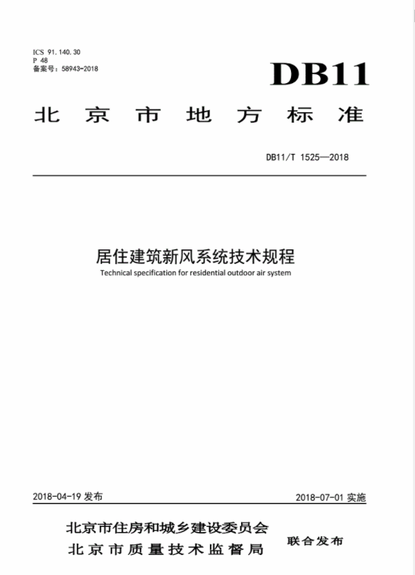 經北京市質量技術監督局批準,北京市質量技術監督局、北京市住房和城鄉建筑委員會共同發布的《居住建筑新風系統技術規程》于2018年7月1日正式開始實施。該標準的實施,對北京地區新風系統應用提出了標準性指導方法,對其他省市規范居住建筑新風系統的設計、施工、驗收和運行維護具有指導作用。